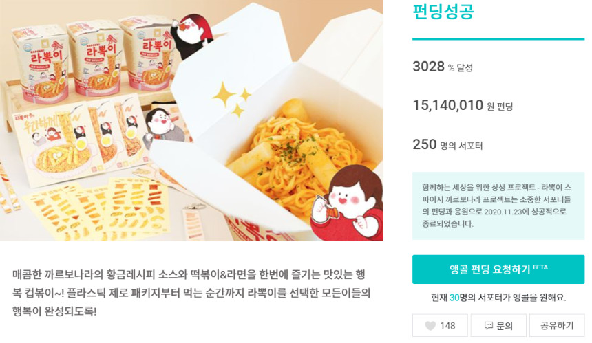 2020년 와디즈 펀딩으로 첫 선을 보인 라뽁이 스파이시 까르보나라입니다.